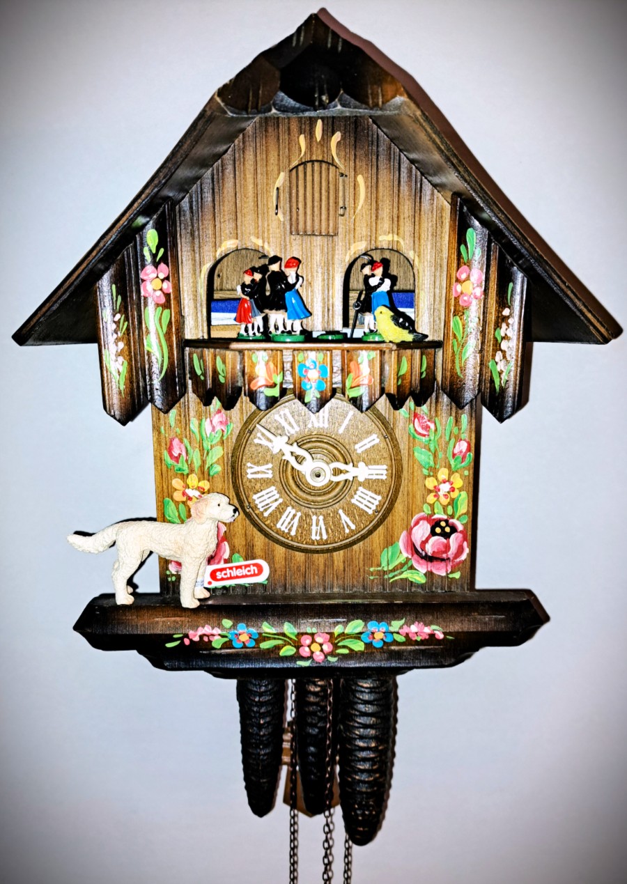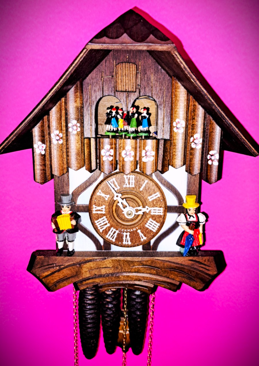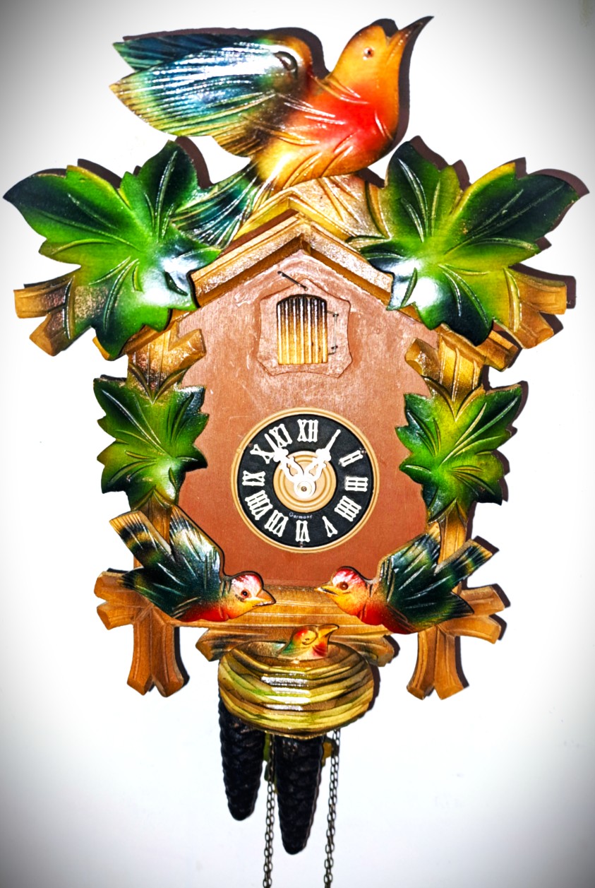 These new era Cuckoo Clocks were made with very odd colors yet modern. They also did not sound like most electronic coo-coo sounds as it does not have the waterfall sound or echoes, just the plane old coo-coo sound. This one was put away because the tripper on the movement did not activated the coo-coo sound so we installed a new movement* with its new tripper except that this movement trips the coo-coo sound at the top of the hour by every hour, no night silencer. It has a on/off volume control, if you turn it off there’s no sound but the cuckoo bird will come out. Uses 3 C cell batteries, measures appx 10 inches high by 8 inches across and about 4 inches deep.
