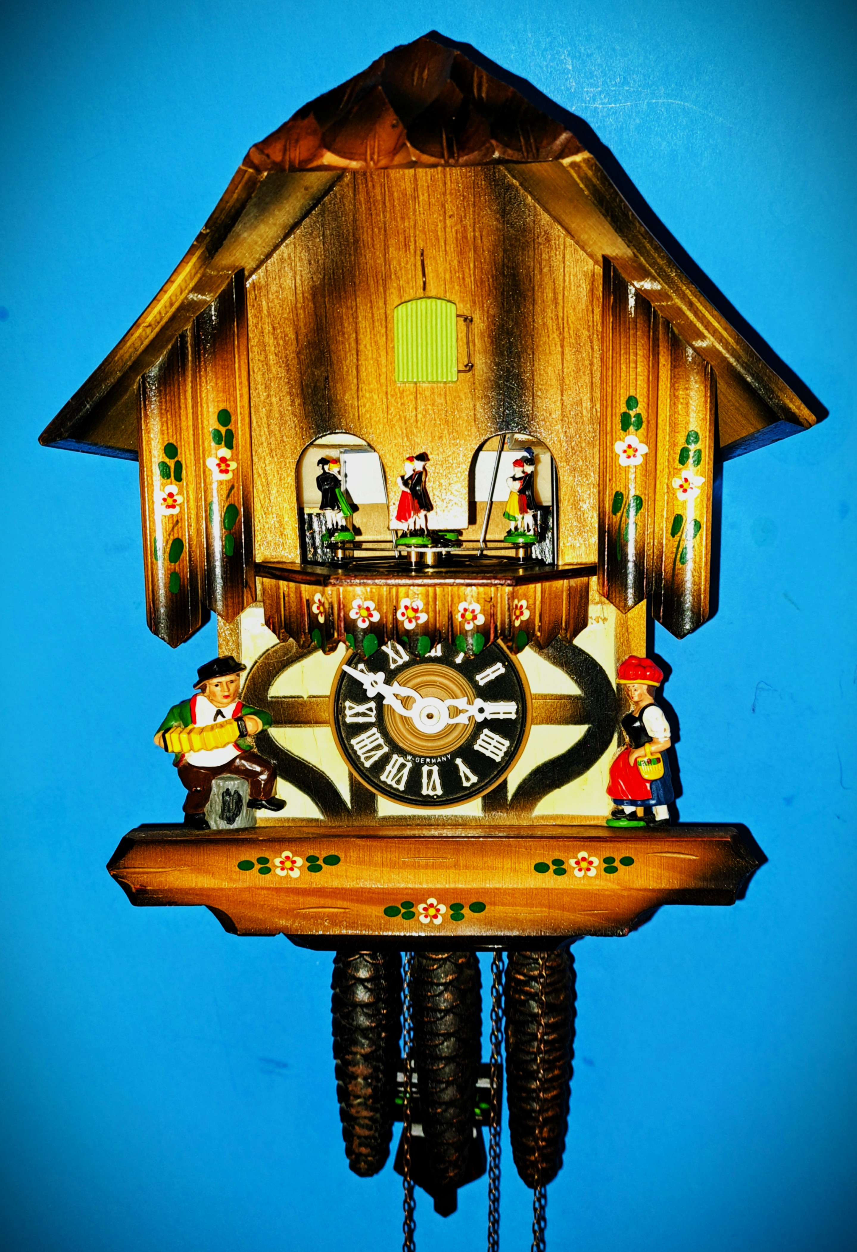 Must love those that are put away and forgotten once the Top bellows breaks. #201 & 202 are about the same and even same year!. This one is dated December 1969 and completely intact, nothing broken or fixed, we did apply glue internally at al critical joints to keep them strong as it was when it was new. We also installed a few new parts like the top-bellows and clock hands and pendulum. All metals were sonically cleaned and oiled, the movement looks Bright and Tight as the music box. These pre-1970s has the all metal dancer’s platform not plastic, favorite amoungs collectors. Music box plays ‘Blaue Donau’ at every top of the hour as the dancers goes around. The clock was test-run for 4 days before packaging. Measures appx. 12 inches high by 9 inches across and about 6 inches deep. Comes with a Numerical Certificate and with easy pictured set-up instructions.